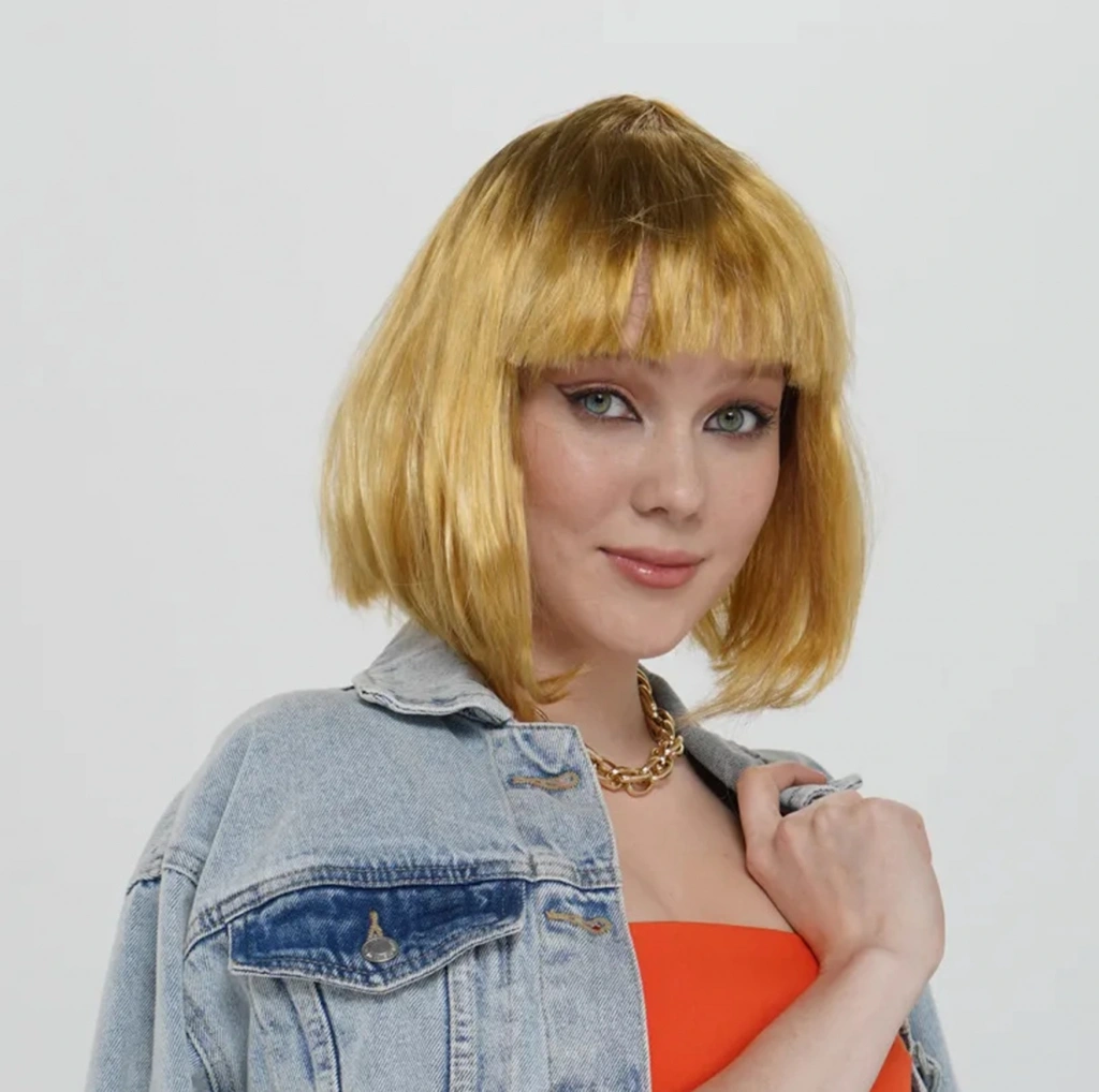 Bu peruk, canlı ve cesur altın rengi ile dikkat çekici bir görünüme sahiptir. Düz kesimi ve kısa oluşu ile modern ve şık bir tarz sunar.