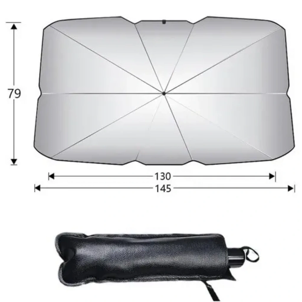 Araba Ön Cam Güneşlik Şemsiye (Katlanabilir) - UV Korumalı, Kolay Kurulum Oto GüneşliğiYaz sıcaklarında aracınızın bir fırına dönüşmesine son verin! Araba Ön Cam Güneşlik Şemsiye, pratik, katlanabilir şemsiye mekanizması sayesinde saniyeler içinde ön camınızı tamamen kapatarak aracınızı Güneş'in zararlı etkilerinden korur. Bu yenilikçi güneşlik, geleneksel modellerin aksine, açılıp kapanması son derece kolaydır.Ürünün Temel Özellikleri ve Avantajları:Üstün Isı ve UV Koruması: Güneş ışınlarına ve ısıya dayanıklı dayanıklı malzemeden (dış yüzeyde ısı yansıtıcı gümüş/iç yüzeyde siyah kaplama) üretilmiştir. UV ışınlarını yansıtarak aracınızın içini serin tutar ve konforunuzu maksimize eder.Şemsiye Mekanizması: Kolay Kurulum ve söküm imkanı sunan katlanabilir yapısı sayesinde, tıpkı bir şemsiye gibi hızla açılır ve yerine oturur (Görsel 5).Geniş Gölgeleme Alanı: Geniş ve esnek tasarımı (Görsel 4'teki boyutlar: ~130-145 cm genişlik, ~79 cm yükseklik) sayesinde ön camın tamamını gölgeleyerek direksiyon, koltuk ve gösterge panelini güneşin yol açtığı solma ve bozulmalara karşı korur.Kompakt ve Taşınabilir: Kullanılmadığında şık, küçük bir deri kılıf içinde toplanır (Görsel 3), torpido gözünde veya kapı cebinde az yer kaplar ve kolayca taşınabilir.Yakıt Tasarrufu: Aracınızın iç ısısını düşürerek klimanın daha az çalışmasına olanak tanır, bu da dolaylı olarak yakıt tasarrufu sağlar.Bu araba ön cam şemsiyesi ile aracınızın ömrünü uzatın ve sıcak yaz günlerinde konforunuzu artırın.