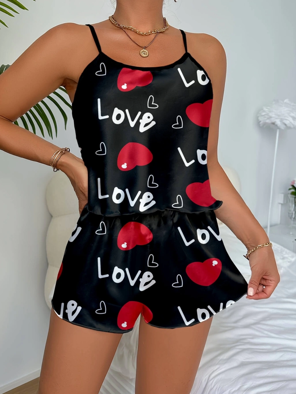 Aşk Temalı Kalp Desenli Siyah Saten Şortlu Gecelik Takım