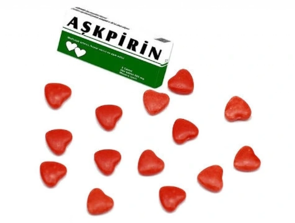 Gerçek ilaç kutusu şeklinde tasarlanmış olan aşkpirinin içerisinde kalp şeklinde renkli drajeler bulunmaktadır.
