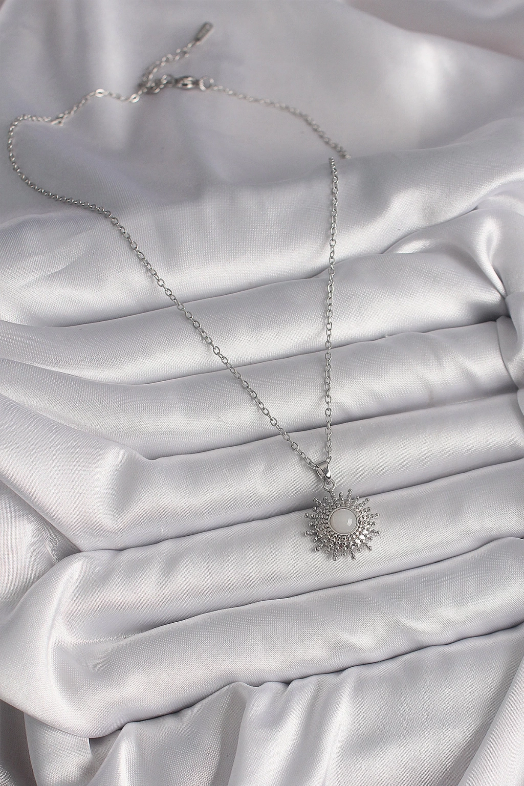 BFS 316L Çelik Gümüş Renk Zincir Beyaz Mineli Güneş Model Kadın Kolye