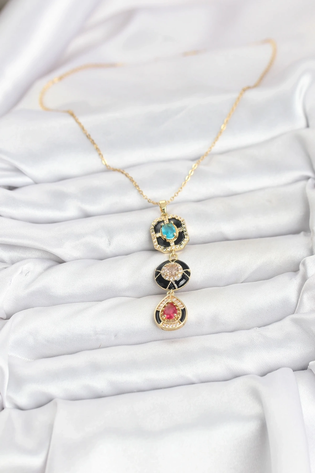 BFS 316L Çelik Gold Renk Siyah Mineli Zirkon Taşlı Yonca Figürlü Kolye