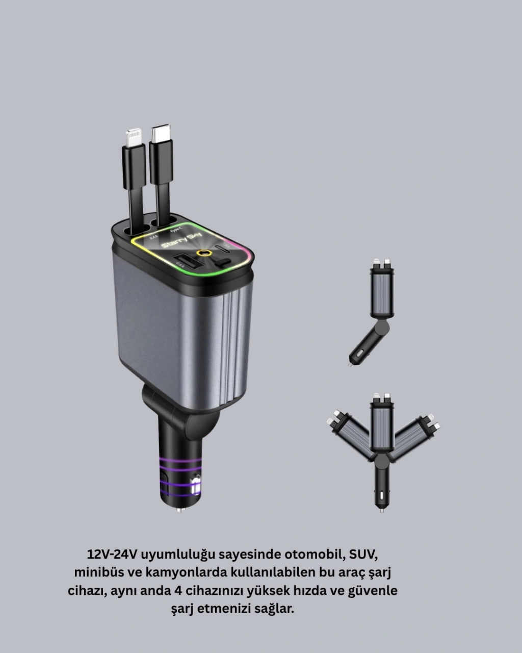 BFS Araç Şarj Cihazı 4 Portlu 66W Hızlı Şarjlı LED Işıklı ve 180° Dönebilir