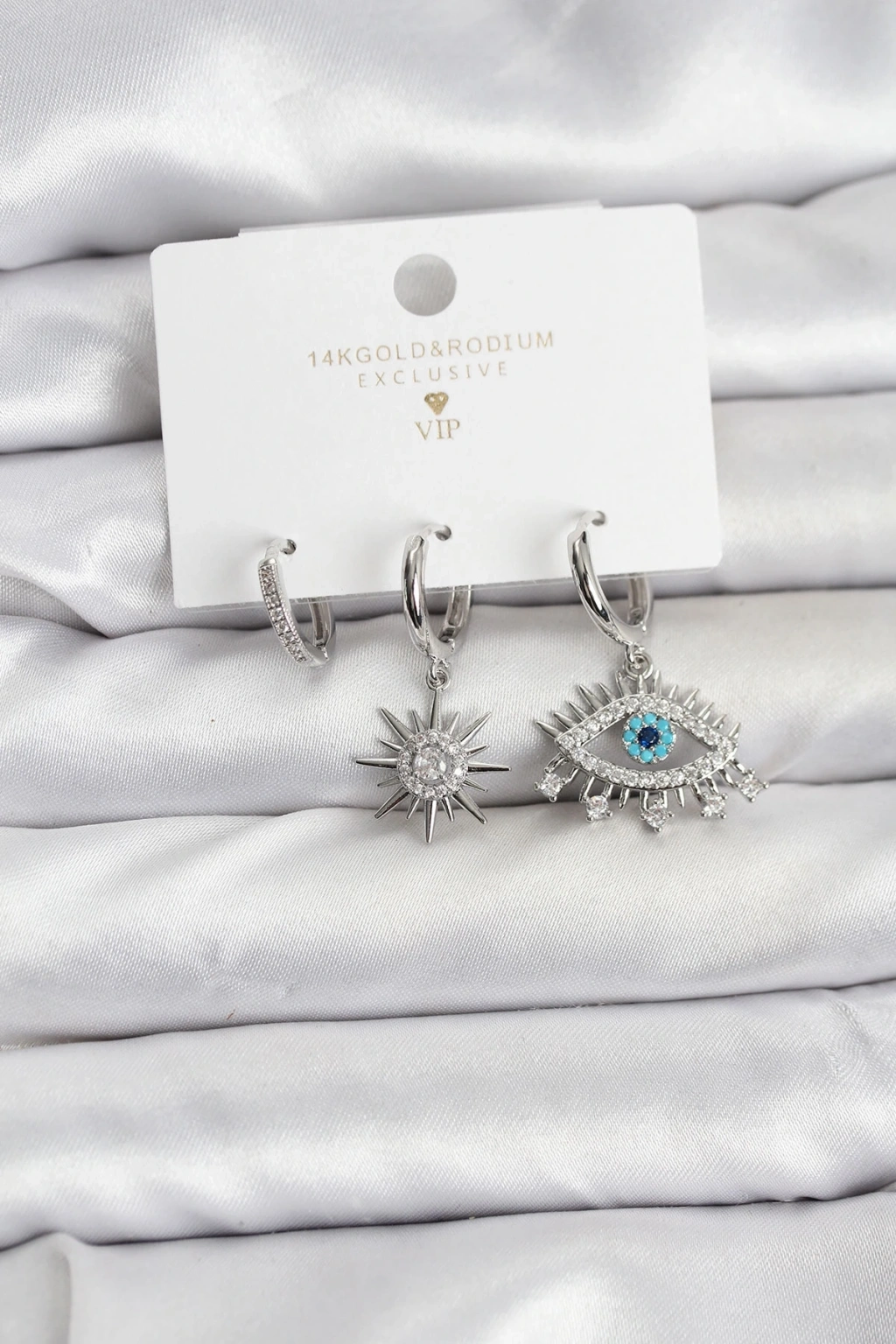 BFS Göz Model Gümüş Renk Pirinç 3'lü Kadın Küpe Seti
