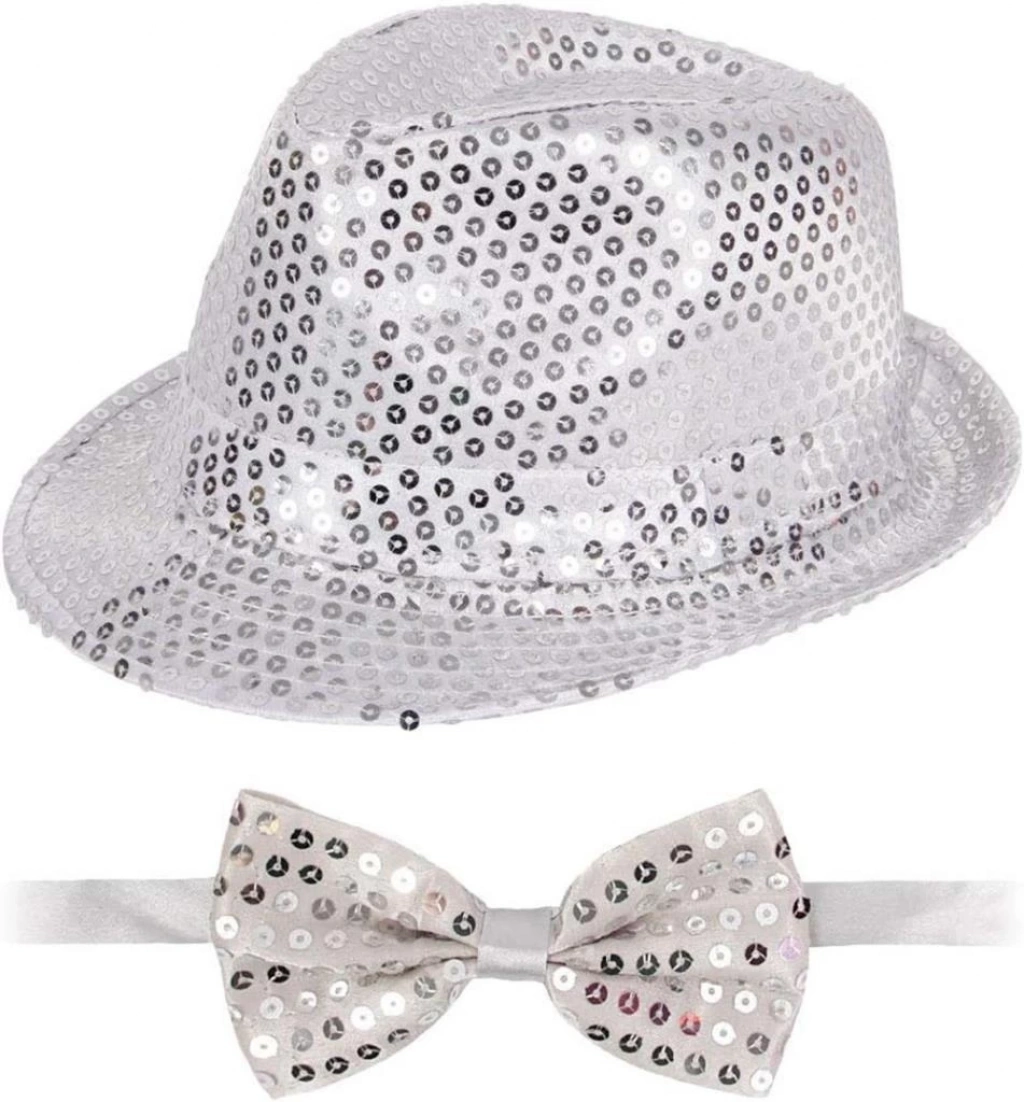 BFS Gümüş Payetli Şapka ve Papyon Seti – Parıltılı Yetişkin Kostüm Seti