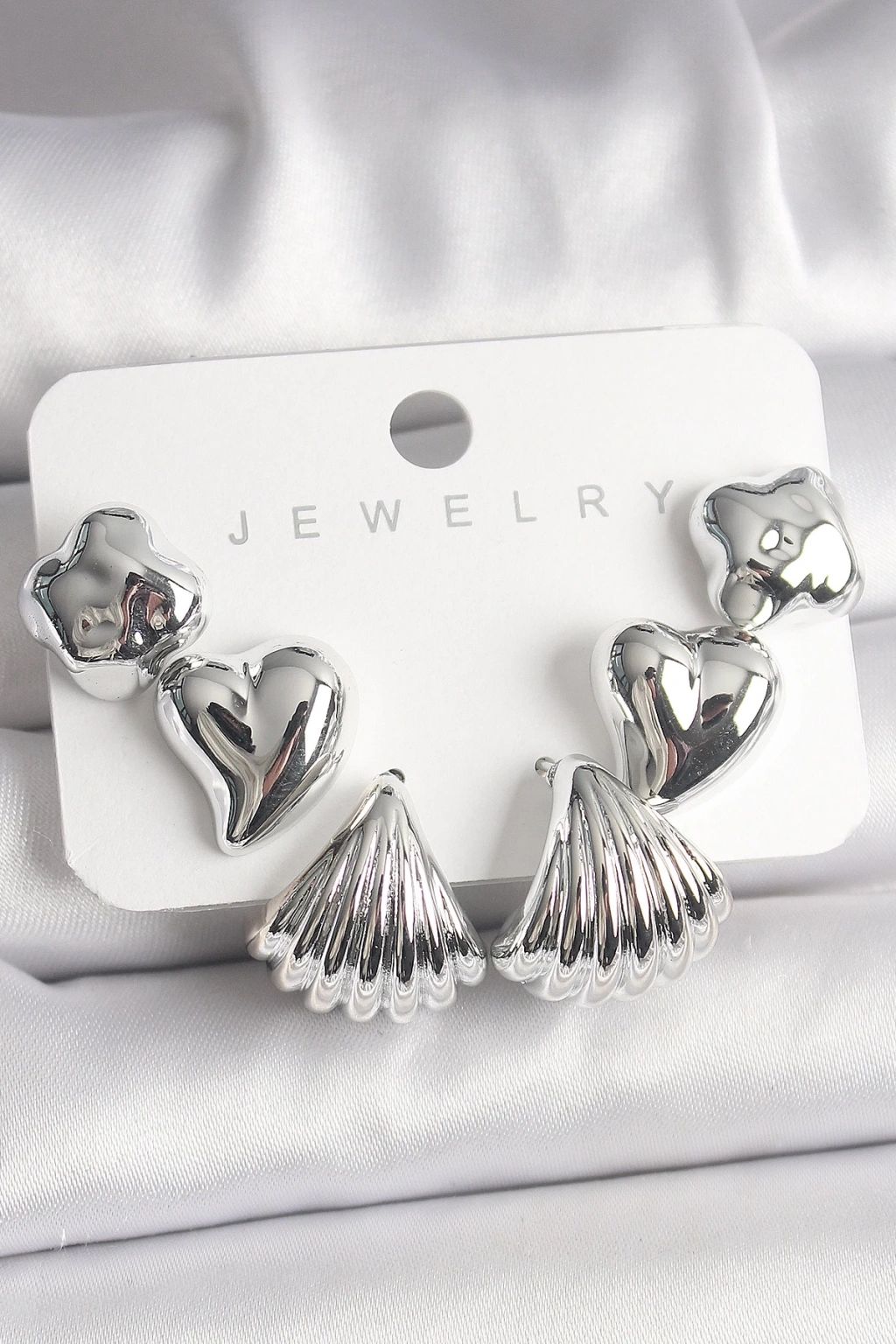 BFS Gümüş Renk Yonca Kalp Deniz Kabuğu Figür CCB Kadın Küpe Seti