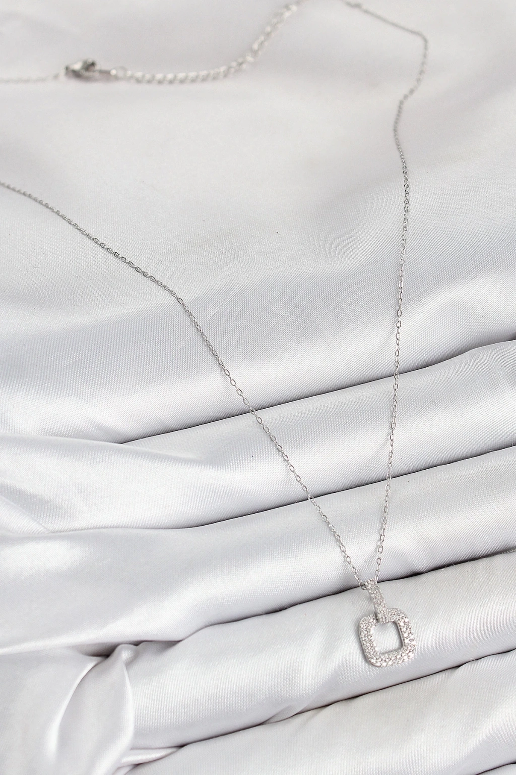 BFS Pirinç Zirkon Taşlı Kare Model Gümüş Renk Kadın Kolye