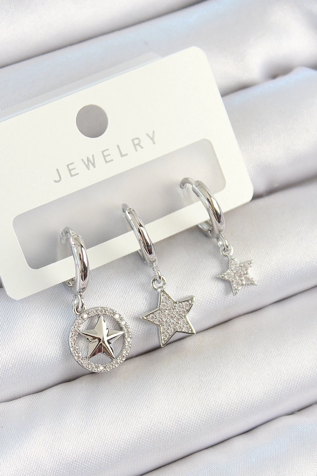 BFS Pirinç Zirkon Taşlı Yıldız Model Gümüş Renk 3'lü Çift Kadın Küpe Set