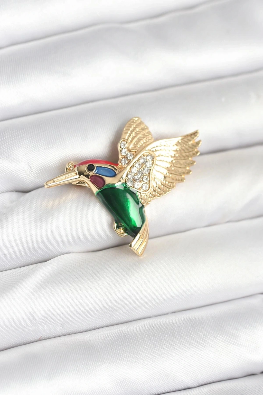 BFS Pirinç Gold Renk Yeşil Deniz Atı Model Zirkon Taş Detay Kadın Broş