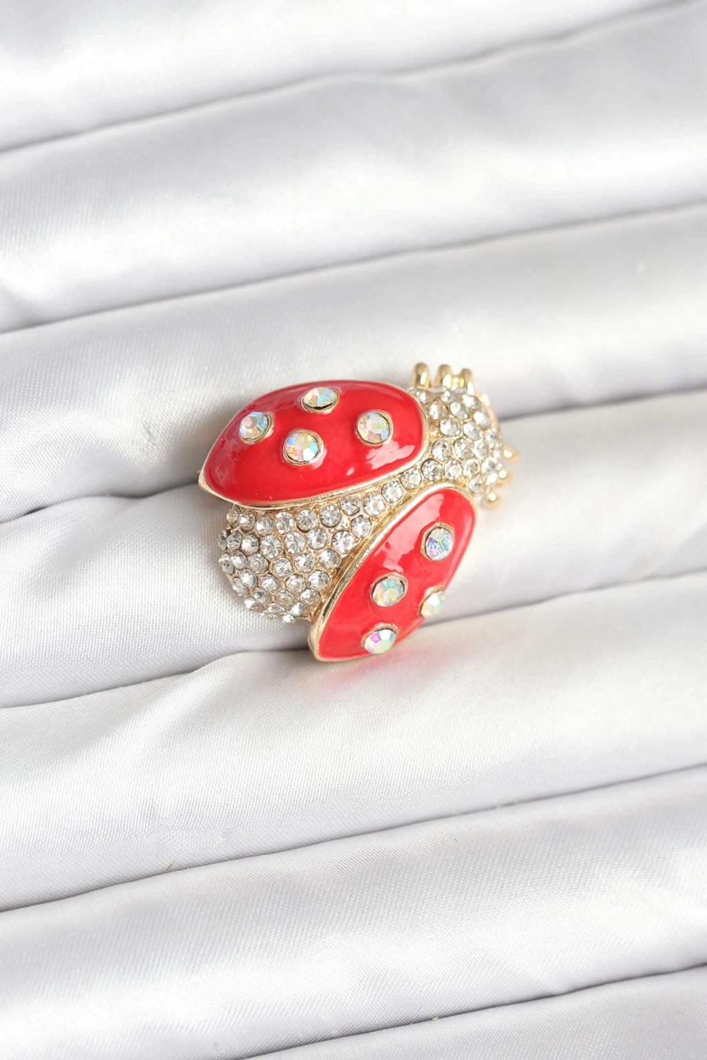BFS Zirkon Taşlı İnci Detaylı Kırmızı 3D Kraliçe Taç Figürlü Gold Renk Kadın Broş