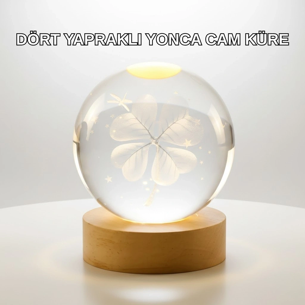 BFS Yonca Figürlü Cam Küre USB Işıklı Ahşap Tabanlı Dekoratif Masa Lambası