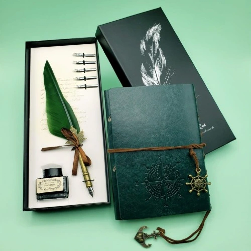 Deri Defter ve Tüylü Mürekkepli Kalem Seti Deri Defter ve Tüylü Mürekkepli Kalem Seti, pusula tasarımlı deri defteri ve divit mürekkepli kalemi ile özel bir hediye seçeneğidir. Set, hem kendiniz için hem de sevdiklerinize verebileceğiniz anlamlı ve şık bir hediyelik alternatiftir.Divit kalemin metal uç kısmı tüylü olup, yanında 5 farklı yazı başlığı ve mürekkep seti bulunur. Defter, suni deri kapaklı ve eskitme görünümlü tasarımıyla özgün bir kullanım sunar. 75 yaprak (150 sayfa) çizgisiz sayfalarıyla not almak veya çizim yapmak için uygundur. Set, kişiye özel hale getirilebilecek şekilde tasarlanmıştır ve promosyon ya da hediyelik amaçlarla kullanılabilir.Ürün ÖzellikleriTüylü divit kalem, metal uçlu ve 5 farklı yazı başlığı ileDivit kalem mürekkebi set içerisinde bulunurDefter suni deri kapaklı ve eskitme görünümlüdürÇizgisiz sayfalı defter, 75 yaprak / 150 sayfaDefter üst kısmında pusula baskısıErgonomik ve şık tasarımKişiye özel özelleştirme imkânıÜrün ÖlçüleriDefter: 18.5 cm x 12.5 cm