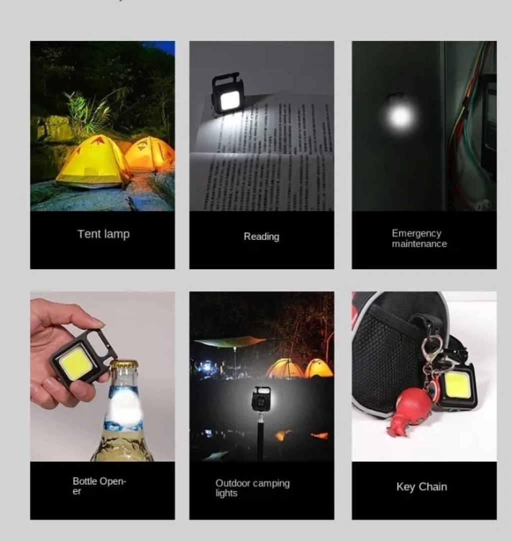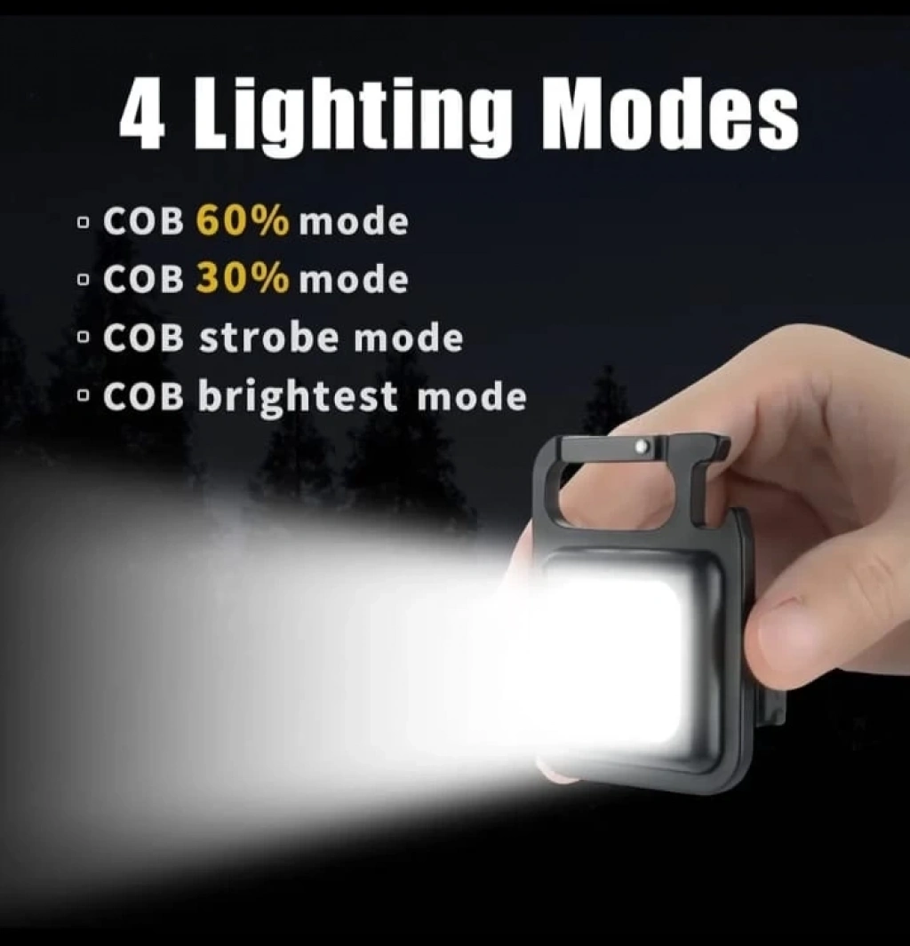 4 aydınlatma modu: anahtarlık el feneri 4 aydınlatma modları vardır-COB yüksek modu, COB düşük modu, COB strobe modu ve uzun basın güç düğmesi 2-3 saniye parlak.