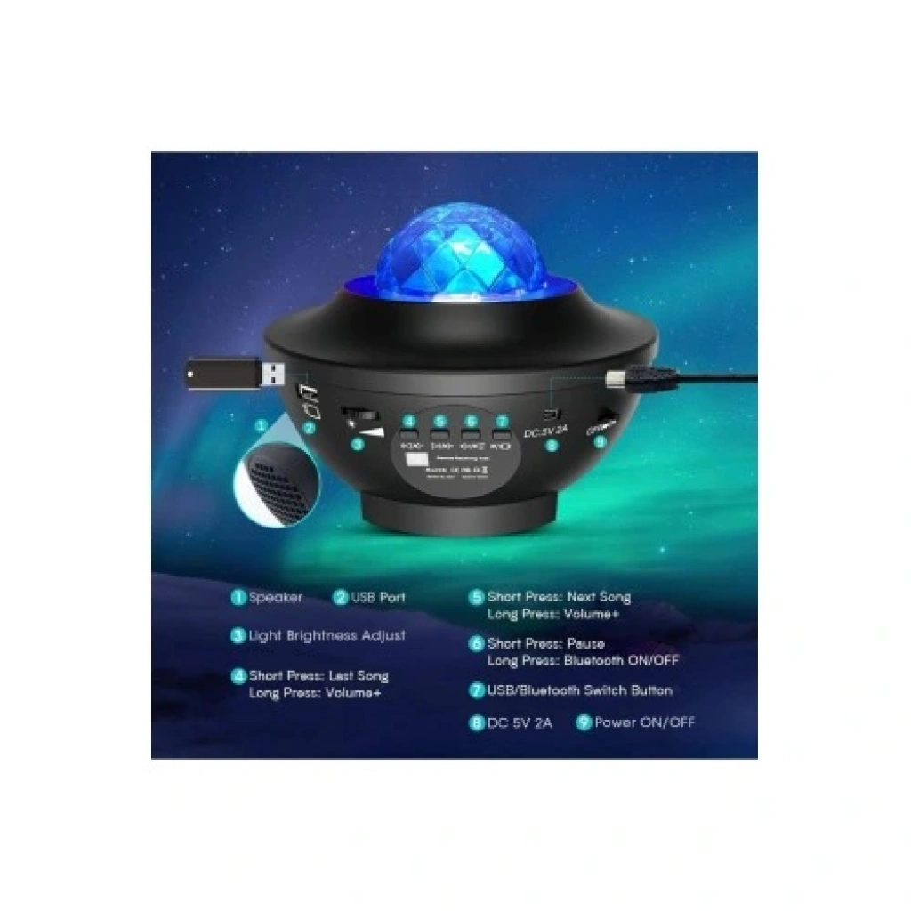 Galaxy Cover Multifonksiyon ProjektörÜrün Açıklaması:Ev dekorasyonunda yıldızlı gökyüzü atmosferi! Galaxy Cover Multifonksiyon Projektör, 10 farklı projeksiyon modu ile evinizi, ofisinizi veya etkinlik alanınızı büyüleyici bir galaksiye dönüştürür. Yıldızlar, bulutlar ve ay efektleriyle huzurlu bir ortam oluşturur.Bluetooth ve hoparlör özellikleri sayesinde müzik dinlerken ışıkların sese göre ritim almasını izleyebilirsiniz. Uzaktan kumandasıyla tüm modları kolayca kontrol edebilir, dilediğiniz renk ve parlaklıkta ışık ayarı yapabilirsiniz.Kullanım Alanları:Ev dekorasyonuÇocuk odasıParti ve özel etkinliklerDinlenme ve meditasyon alanlarıÜrün Özellikleri:10 farklı ışık moduBluetooth ve hoparlör desteğiSese duyarlı ışık senkronizasyonuUzaktan kumanda ile kontrolUSB bağlantılı kullanımABS plastik gövdeBoyut: 15 cm çap x 10 cm yükseklikBakım:Kuru bir bezle temizleyiniz.Paket İçeriği:1 x Galaxy Cover Multifonksiyon Projektör1 x Uzaktan Kumanda