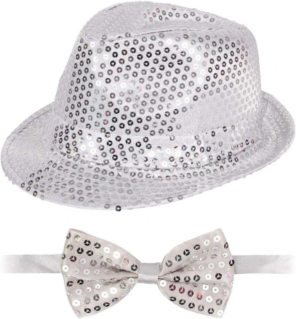 Göz alıcı bir tarz oluşturmak isteyenler için Gümüş Payetli Şapka ve Papyon Seti tam size göre! Işıltılı tasarımıyla özel davetlerden temalı partilere kadar her ortamda fark yaratın.