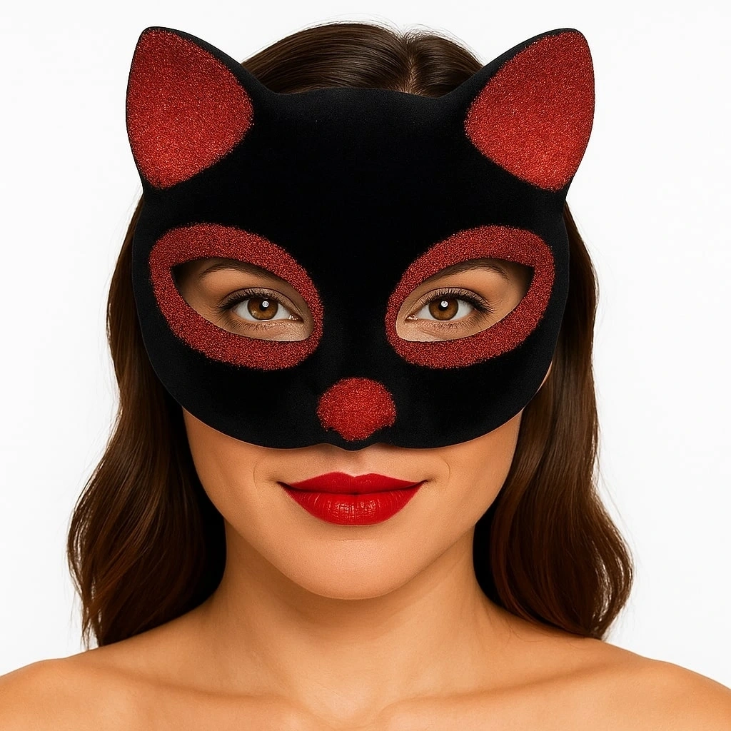 Siyah Renk Kırmızı Simli Süet Kedi Maskesi ile sevimli ve eğlenceli bir görünüm oluşturun ve özel günlerinizi unutulmaz kılın!