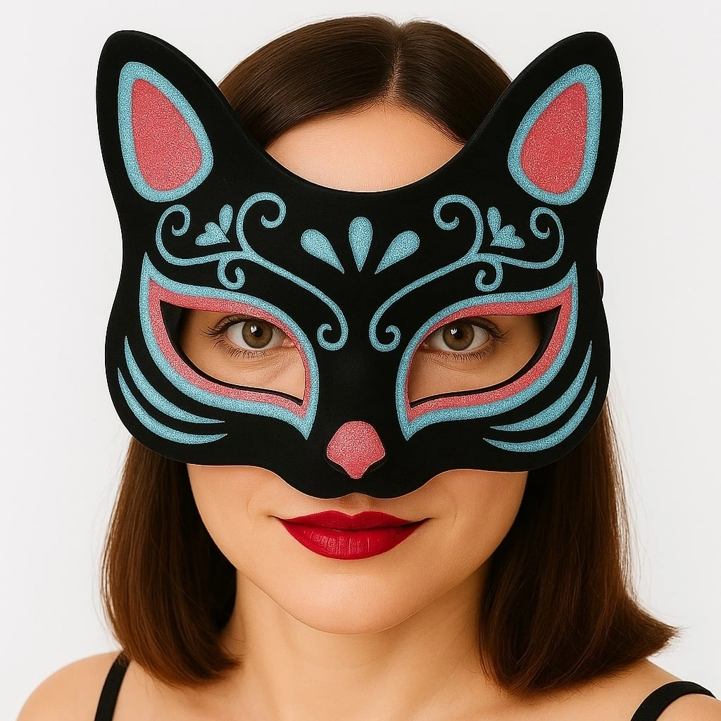 Kostüm maskelerinin en sevimli ve eğlenceli maskelerinden biri olan Siyah Renk Mavi Kırmızı Simli Süet Kaplama Kedi Maskesi ile göz kamaştırın!